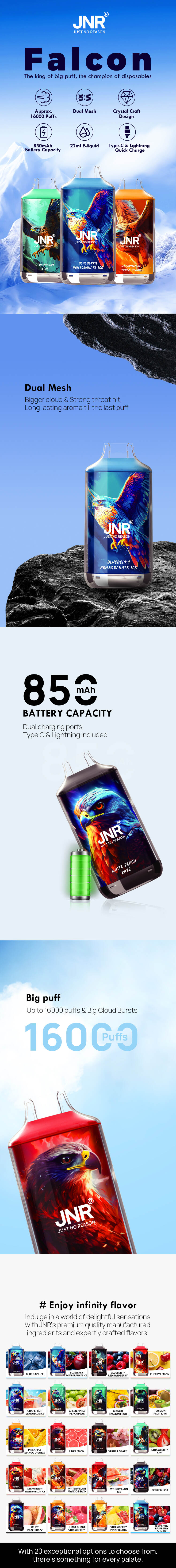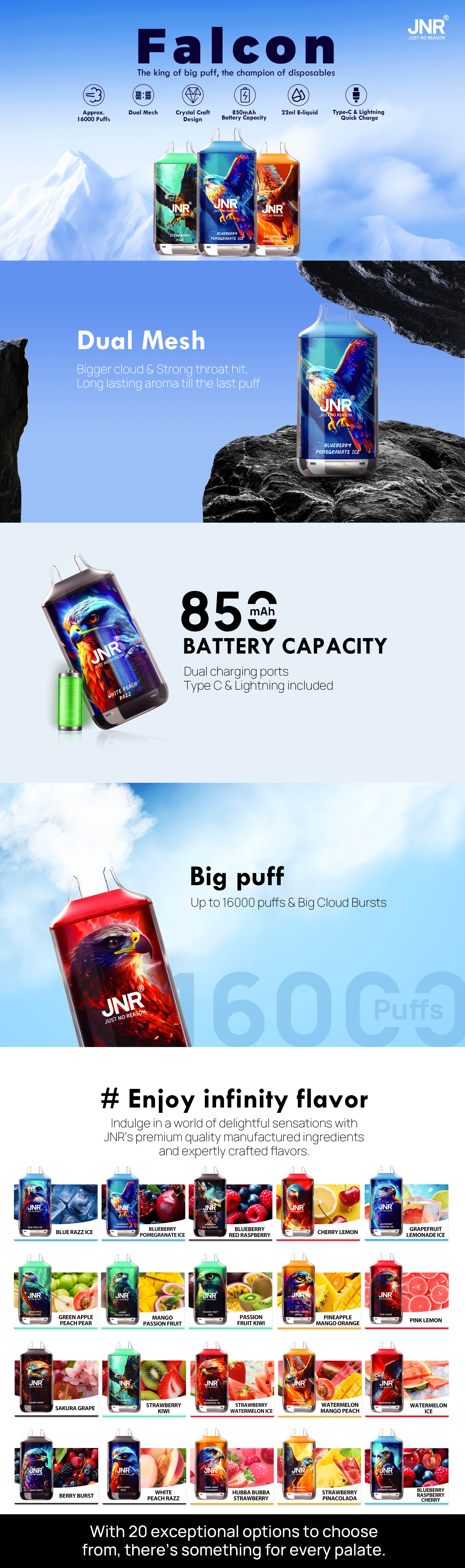 O Falcon oferece uma experiência de vaping incomparável com uma capacidade de aproximadamente 16000 sopros. Escolha entre as opções de nicotina de 0-2% e desfrute de uso ininterrupto alimentado por uma bateria de 850mAh. O elegante design de artesanato de cristal e a tecnologia de malha dupla fornecem sabor excepcional e produção de vapor. Com uma generosa capacidade de 22 ml de e-líquido, ele possui opções de carregamento do tipo C e de raios para versatilidade conveniente. Pontos de venda importantes Big Puff Up até 16000 Pufos e grandes nuvens explodem dupla malha de nuvem maior e forte hit da garganta, aroma duradouro até a última portas de carregamento duplo sopéadas tipo C & Lightning incluído